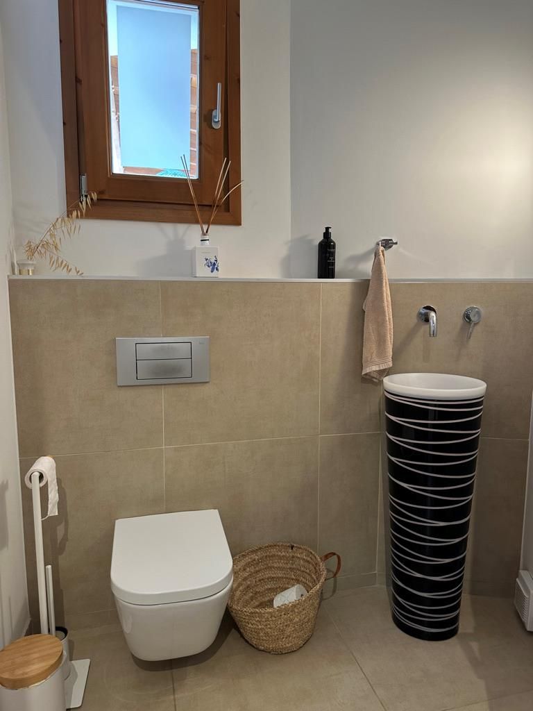 - Badezimmer mit Einzelwaschbecken und Toilette