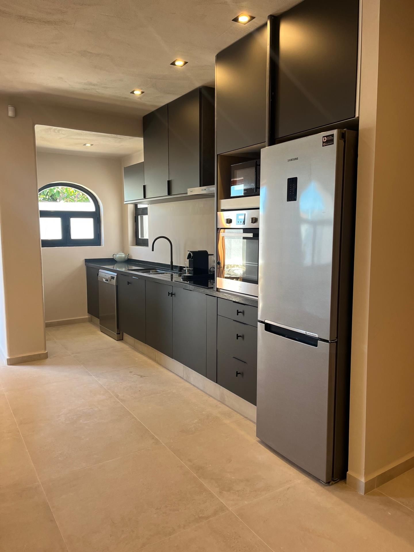 • cuisine ouverte avec plaque de cuisson électrique, four électrique, micro-ondes, lave-vaisselle, réfrigérateur-congélateur, cafetière, bouilloire électrique et grille-pain
