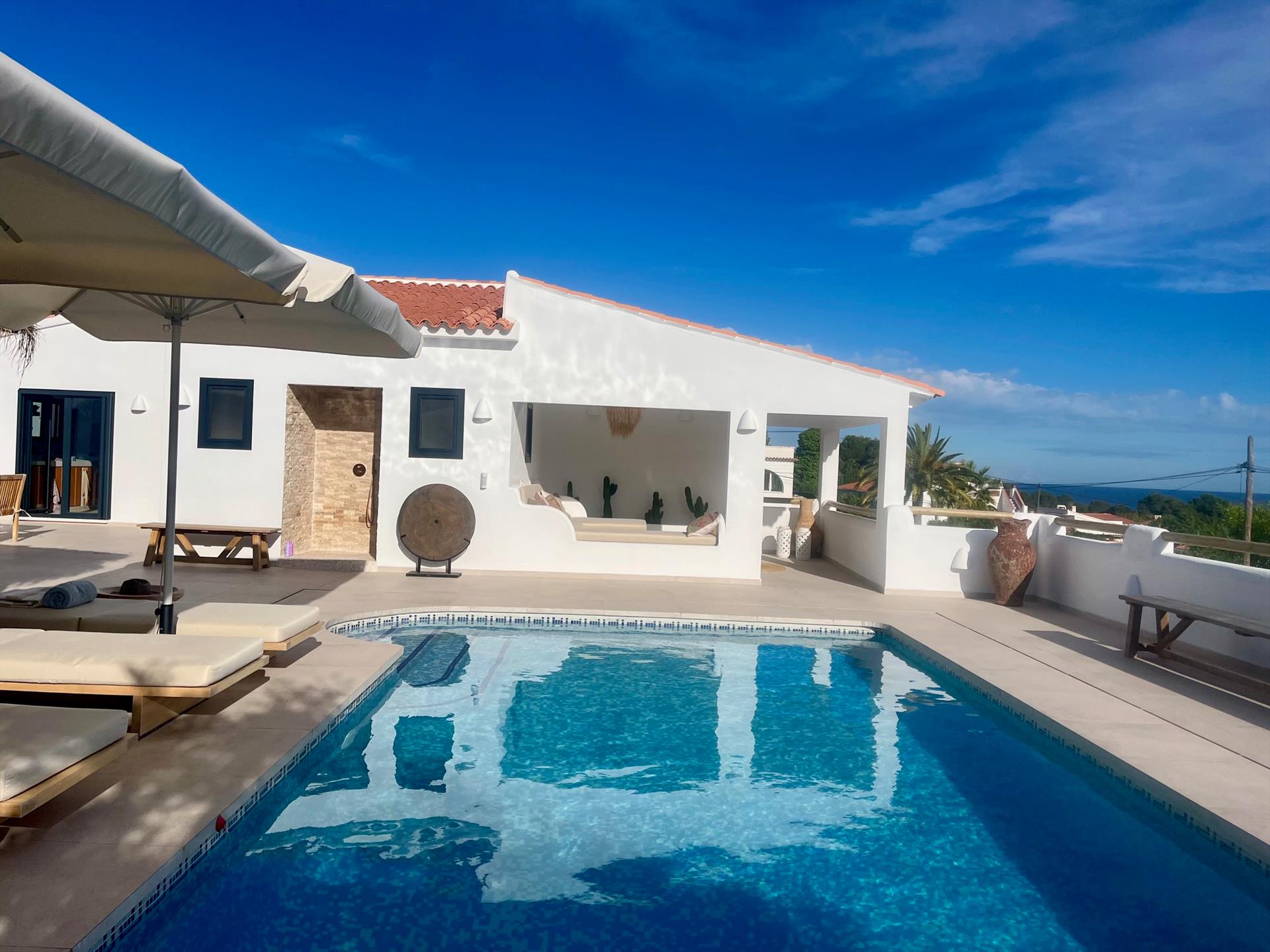 Les invités peuvent profiter de la belle piscine privée et des grandes terrasses qui l'entourent. Les terrasses ouvertes et couvertes sont entièrement équipées, avec une cuisine extérieure sympa et un barbecue, parfait pour les longues soirées d'été sous les étoiles. Que tu veuilles bronzer au bord de la piscine ou te détendre à l'ombre, tu seras partout entouré d'une vue panoramique sur la mer Méditerranée.