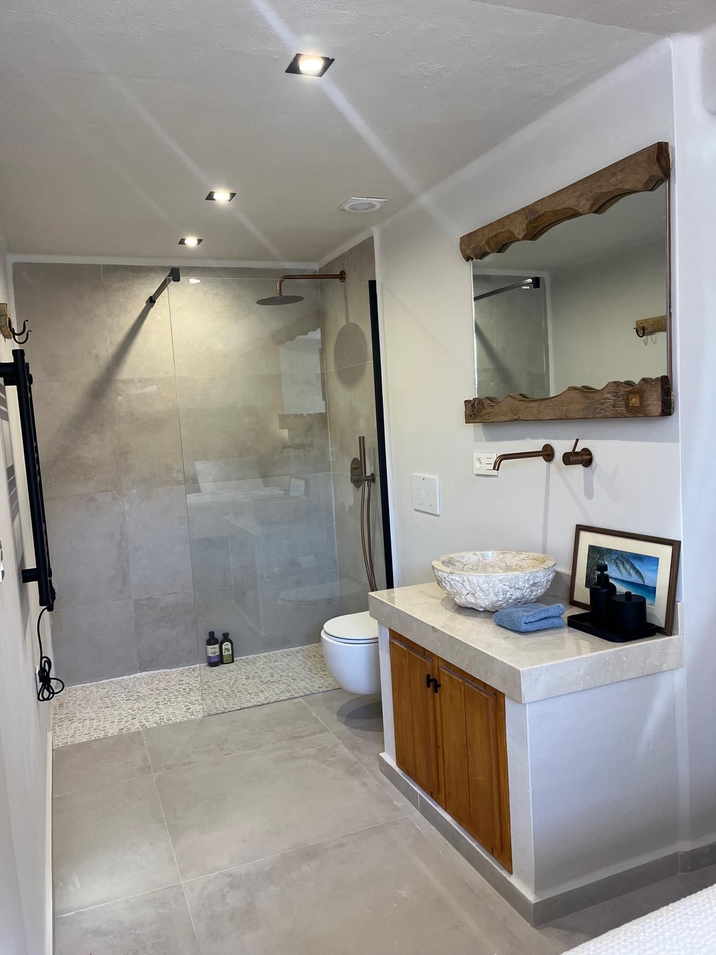 Le rez-de-chaussée a deux grandes chambres, chacune avec une salle de bain, ce qui donne une impression de luxe et d'intimité. Toutes les pièces ont bien sûr la climatisation, pour une température agréable toute l'année.